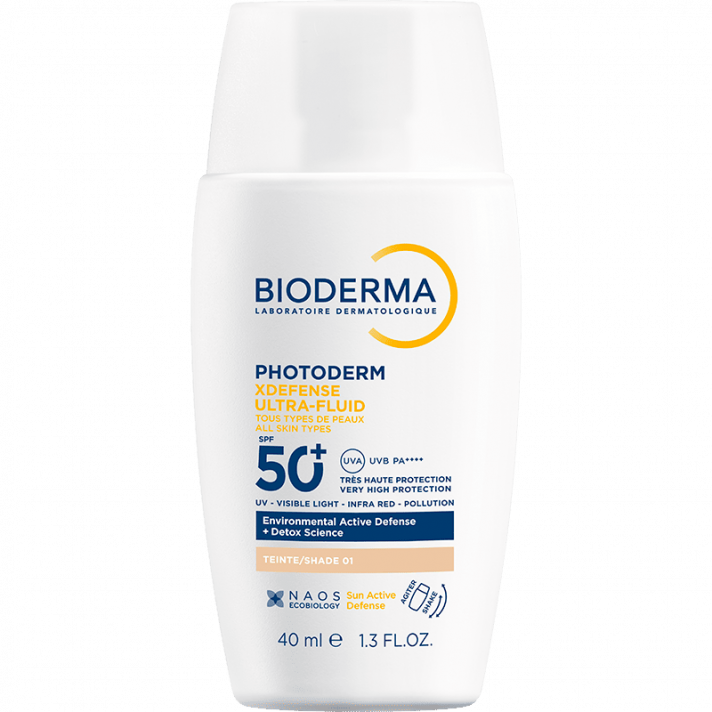 Photoderm Xdefense ultrafluid zaštitna tonirana krema za lice s vrlo visokim UV zaštitnim faktorom. Štiti od UVB, UVA, dugih UVA zraka, vidljive svjetlosti (VIS), infracrvenog zračenja (IR) i onečišćenja, pruža mat efekt i 8 sati hidratacije. Ultra lagana tekstura, savršena kao podloga za šminku.