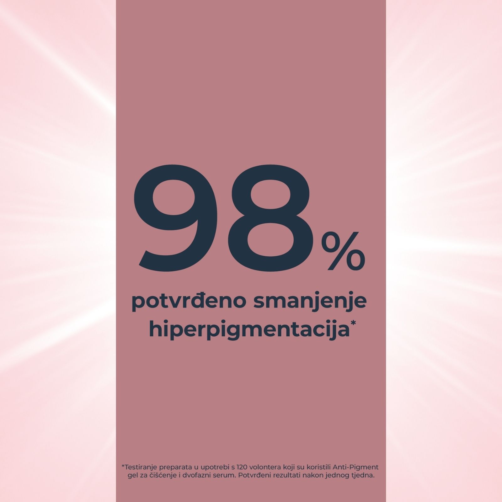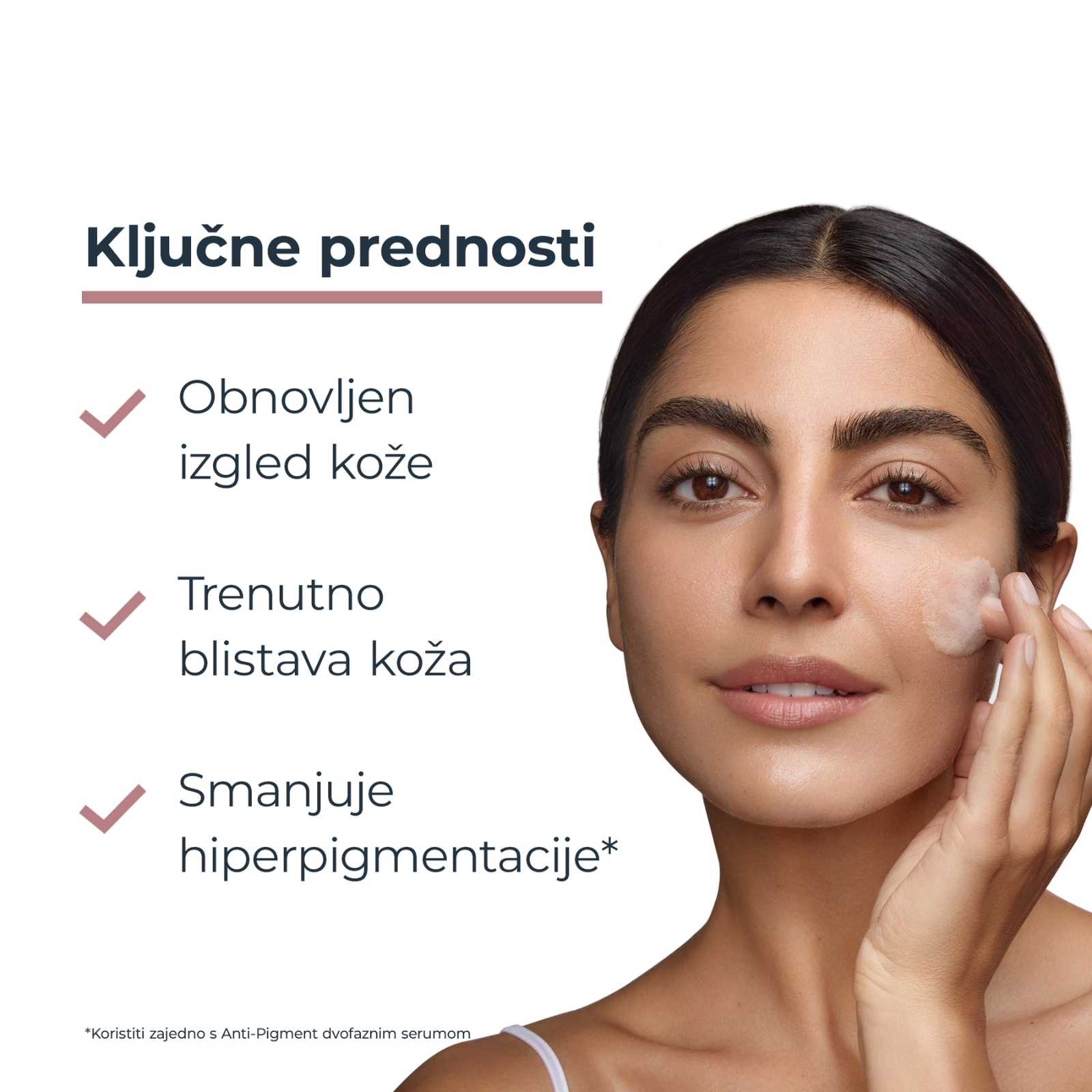 Anti-Pigment gel za čišćenje s mliječnom i glikolnom kiselinom uklanja mrtve stanice kože, pružajući obnovljen izgled kože.