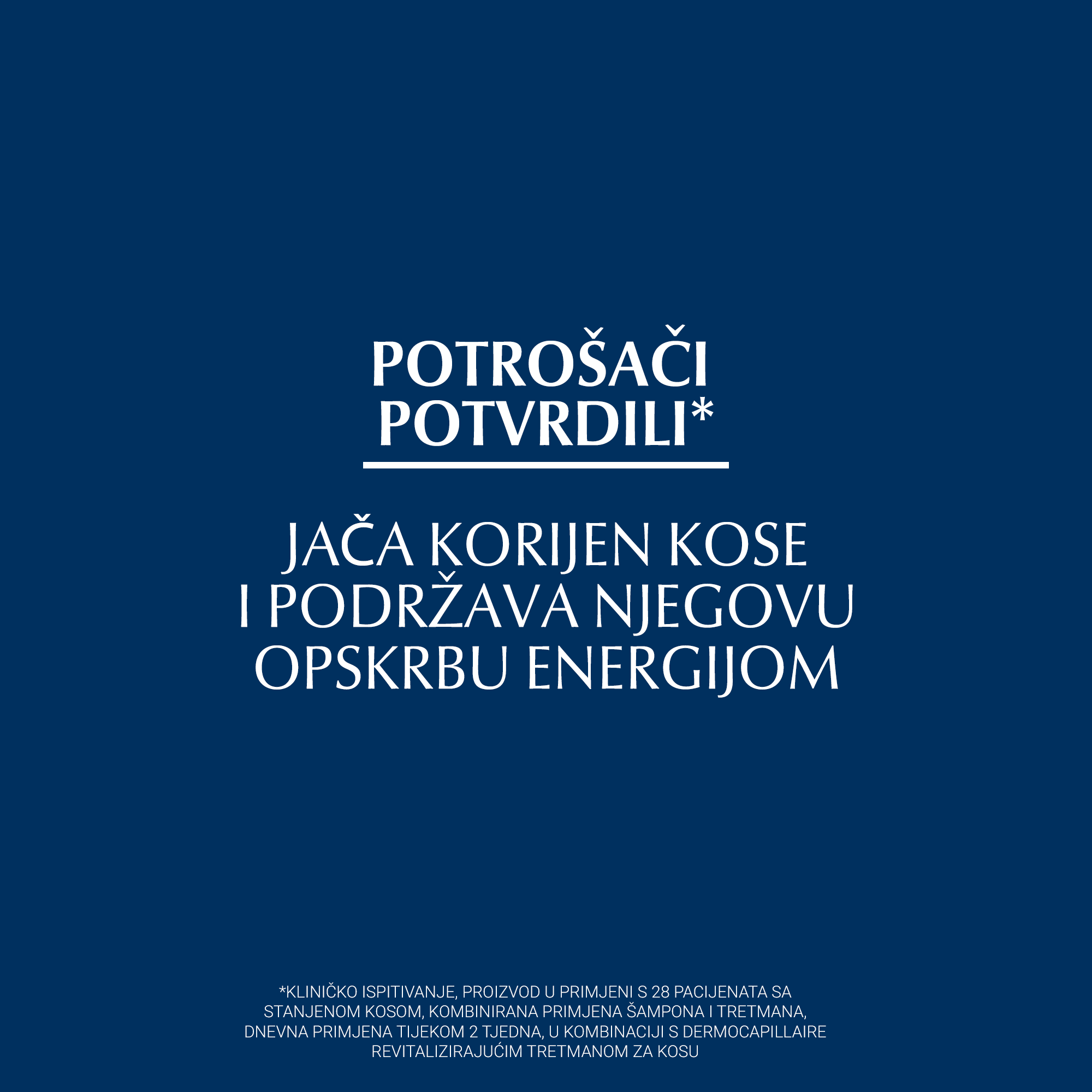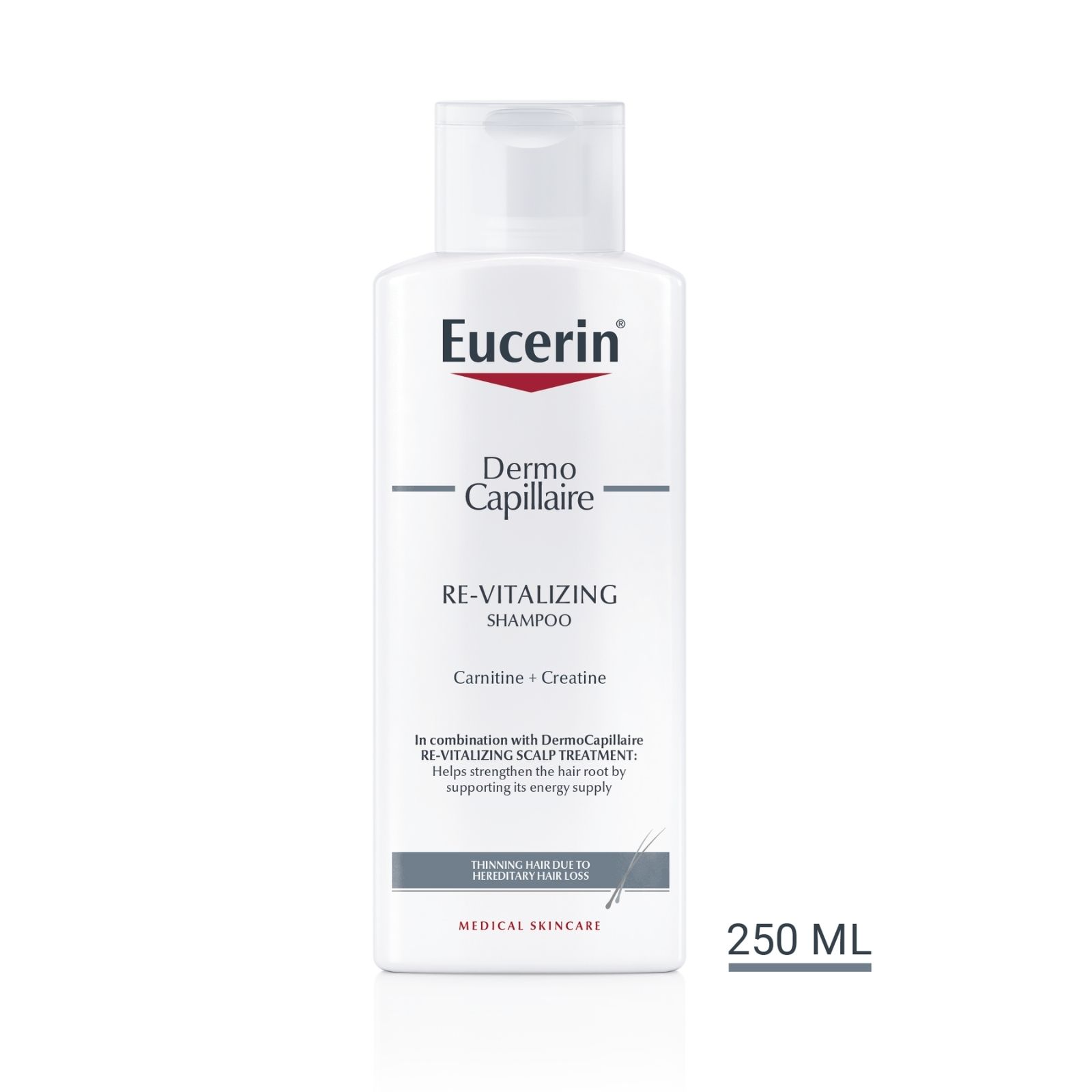 Eucerin DermoCapillaire revitalizirajući šampon posebno je dizajniran za osobe s oštećenjem kose uzrokovanog nasljednim gubitkom kose (najčešći uzrok gubitka kose kod muškaraca i žena). Sadrži dvije aktivne tvari koje se prirodno nalaze u tijelu, karnitin i kreatin kako bi ojačao korijen kose. Kada se koristi u kombinaciji s Eucerin DermoCapillaire revitalizirajućim tretmanom za kosu, snažan duo pomaže u jačanju korijena podržavajući njegovu opskrbu energijom. Eucerin DermoCapillaire revitalizirajući šampon i Eucerin DermoCapillaire revitalizirajući tretman za kosu pružaju joj zdravi sjaj te mekan i podatan osjećaj.