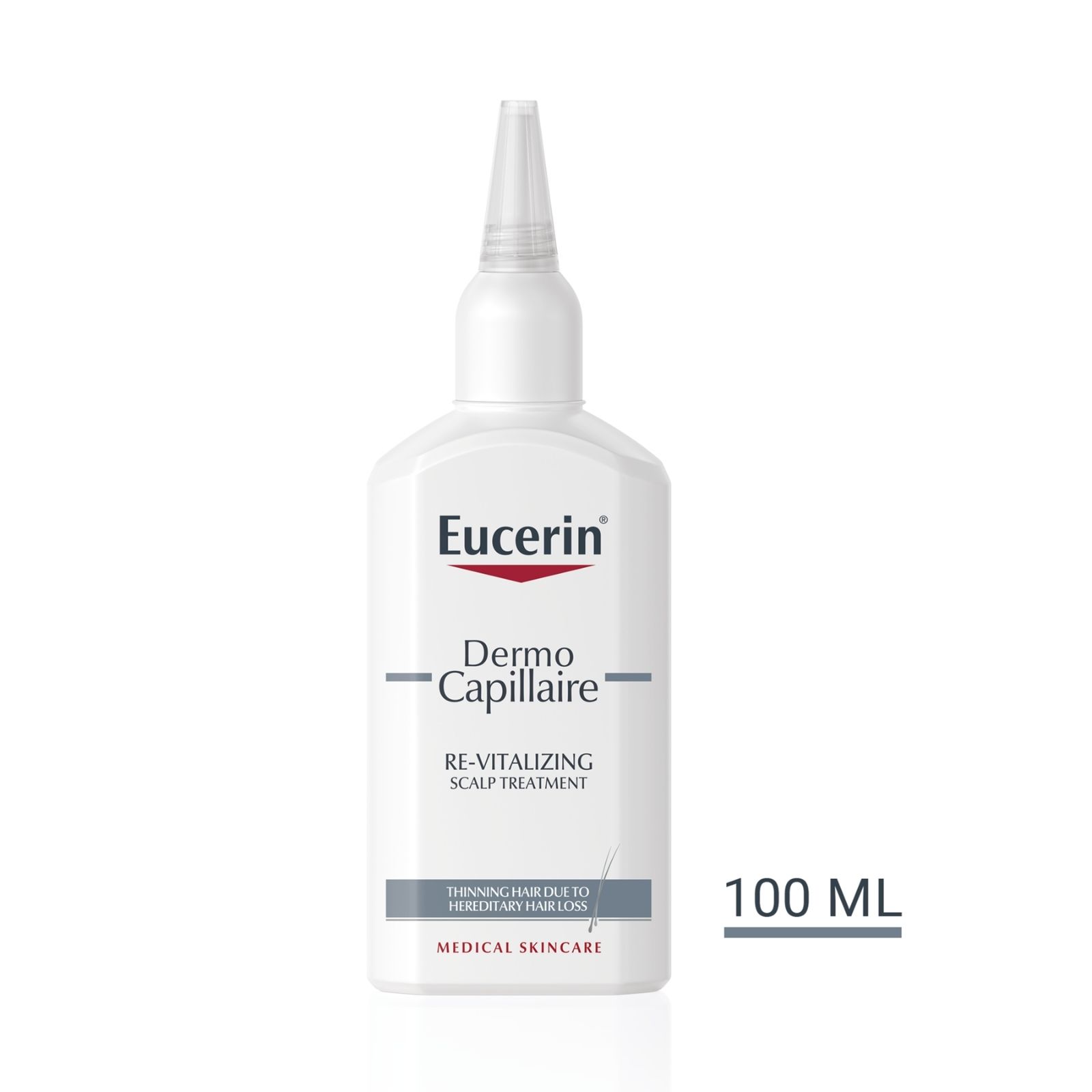 Posebno je dizajniran za osobe s oštećenjem kose uzrokovanog nasljednim gubitkom kose. Sadrži dvije aktivne tvari koje se prirodno nalaze u tijelu, karnitin i kreatin koje pomažu ojačati korijen kose podržavajući njegovu opskrbu energijom te umirujući licochalcone A, za uklanjanje mikroupale koja oslabljuje korijen kose. Kad se redovito koristi, podupire rast kose i stimulira folikul kose. Za optimalne rezultate koristiti u kombinaciji s Eucerin DermoCapillaire revitalizirajućim šamponom.