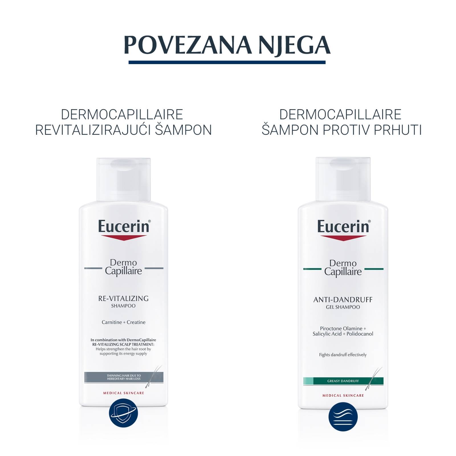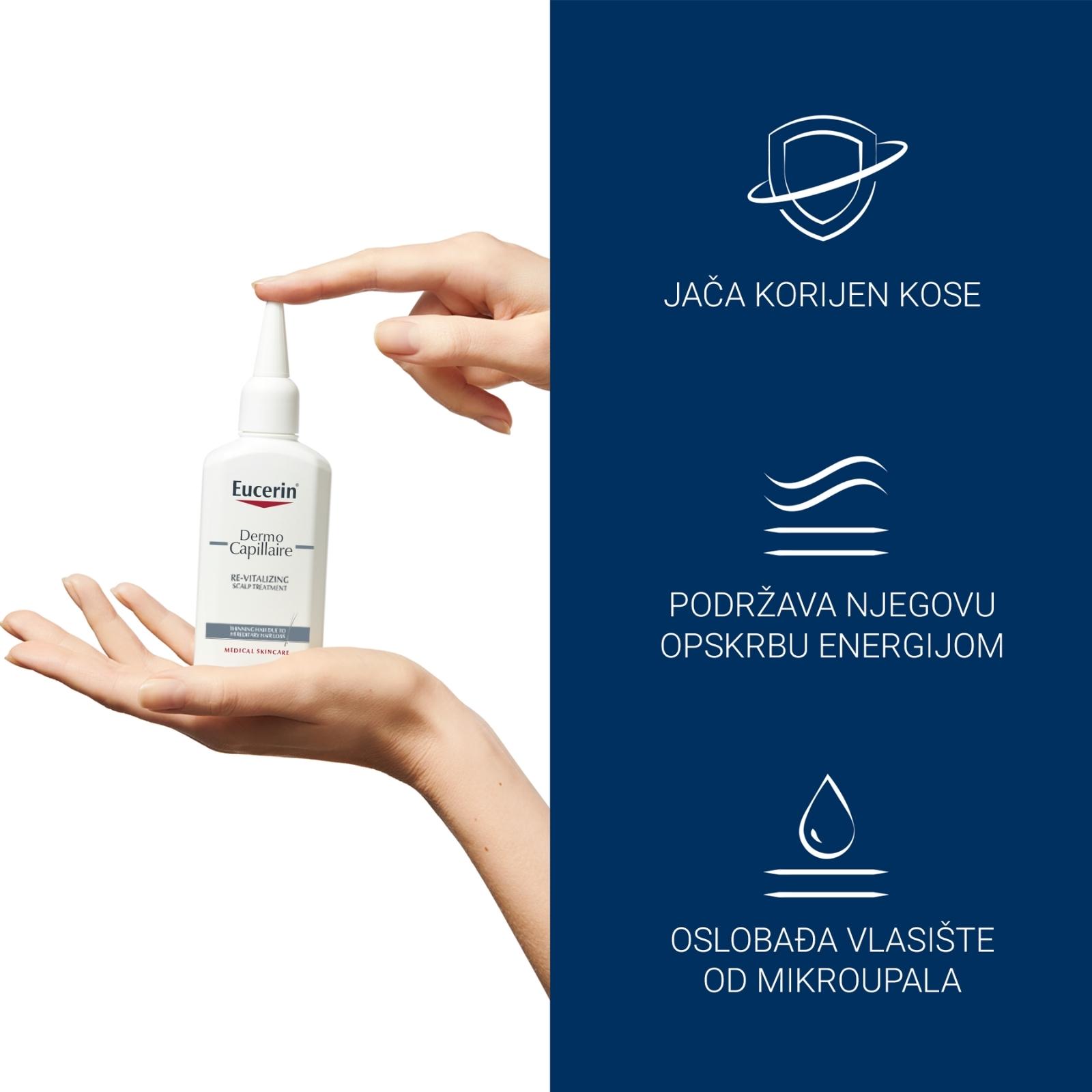 Eucerin DermoCapillaire revitalizirajući tretman za kosu posebno je dizajniran za osobe s oštećenjem kose uzrokovanog nasljednim gubitkom kose (najčešći uzrok gubitka kose kod muškaraca i žena). Sadrži dvije aktivne tvari koje se prirodno nalaze u tijelu, karnitin i kreatin koje pomažu ojačati korijen kose podržavajući njegovu opskrbu energijom te umirujući likokalkon A, za uklanjanje mikroupale koja oslabljuje korijen kose.