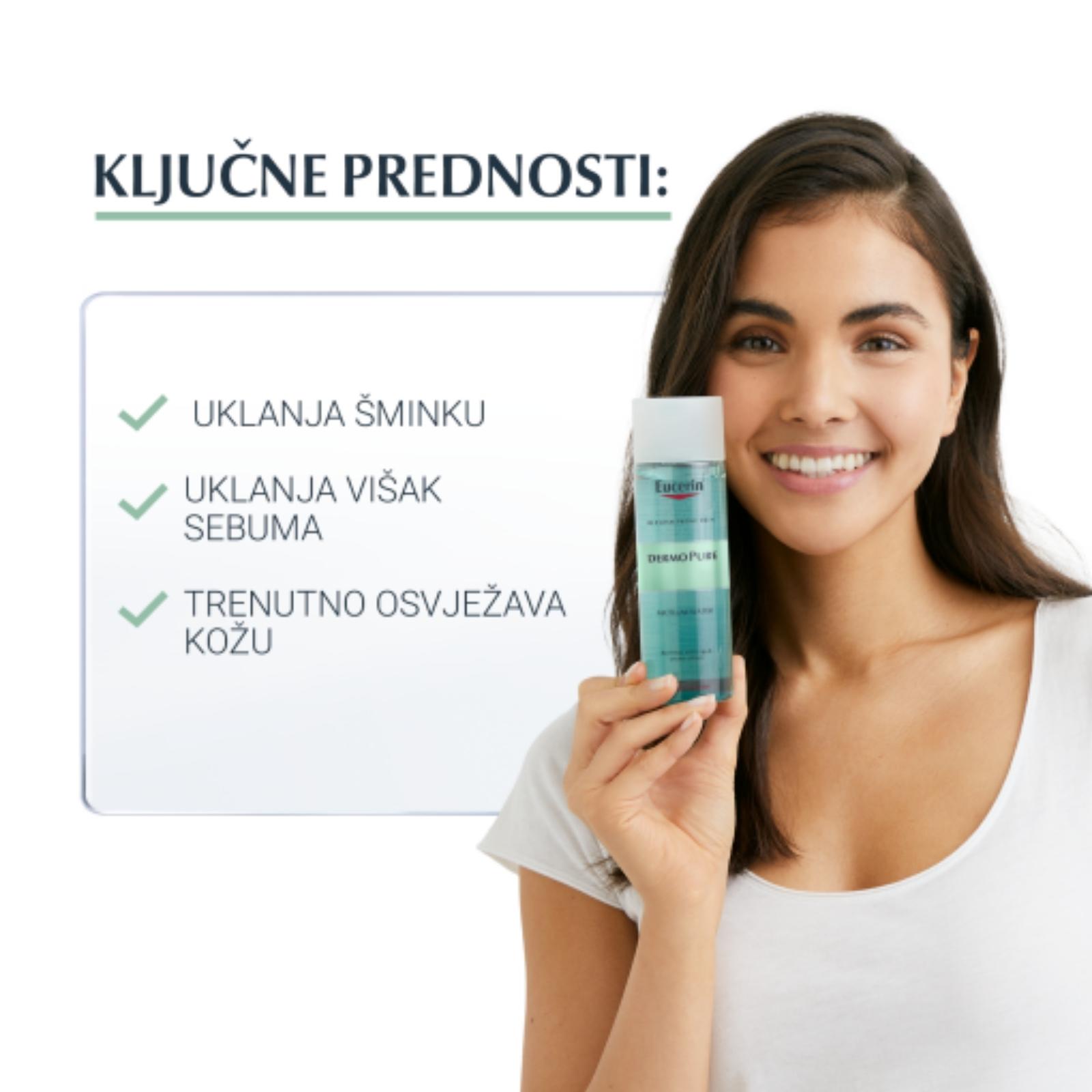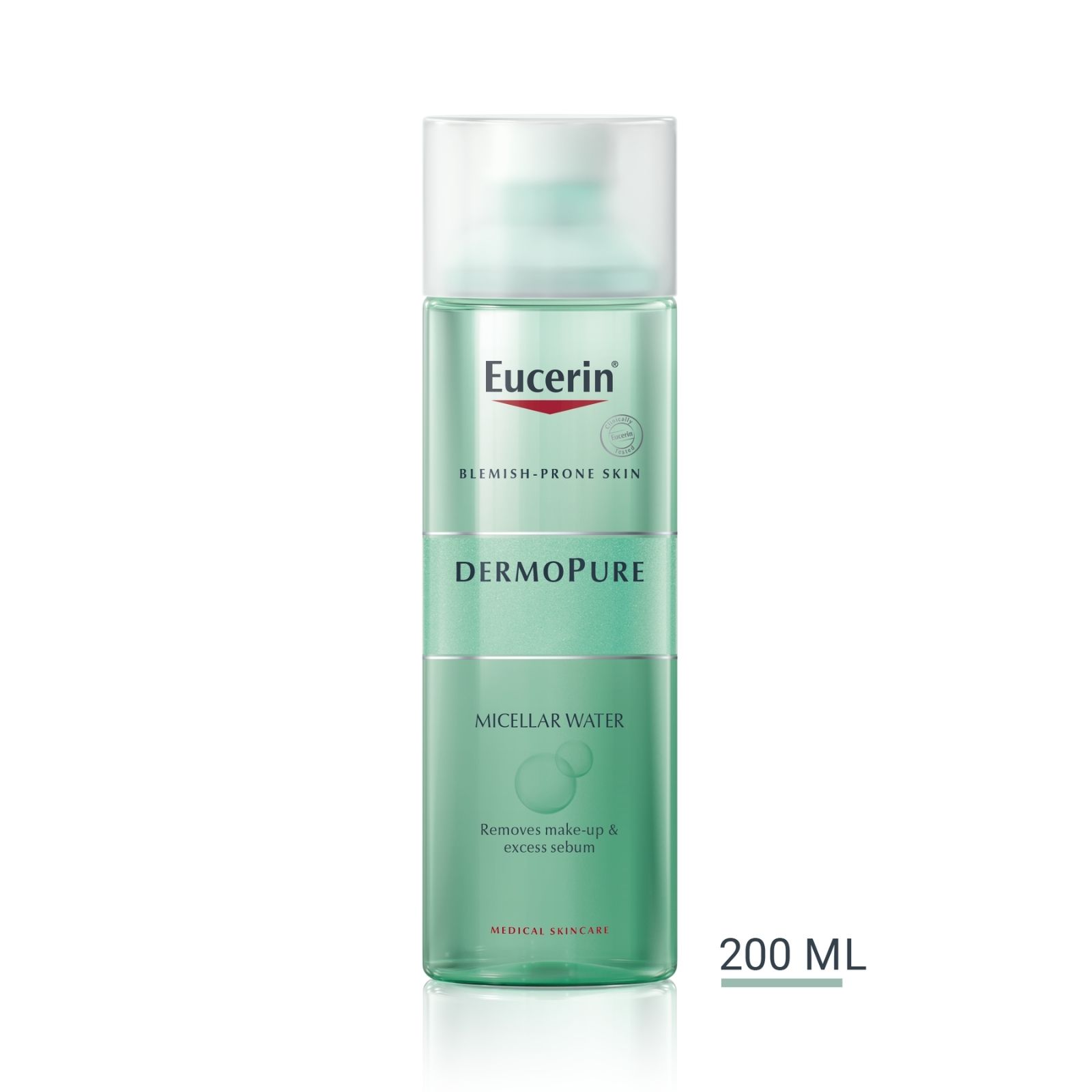 Eucerin DermoPure micelarna otopina je osvježavajuće rješenje s APG kompleksom: učinkovito, ali blago sredstvo za uklanjanje šminke, čišćenje i toniranje. Ne sadrži alkohol i nježno, ali učinkovito uklanja vodootpornu šminku bez iritiranja i narušavanja prirodnog zaštitnog sloja. Jednostavan i praktičan za upotrebu pomaže u pripremi kože za topikalnu terapiju protiv akni ili hidrataciji. Proizvod je testiran i pogodan za osjetljivu kožu i oči. Koža ostaje čista i umirena, vidljivo je glađa i mekša te je dobro pripremljena za sljedeću njegu.