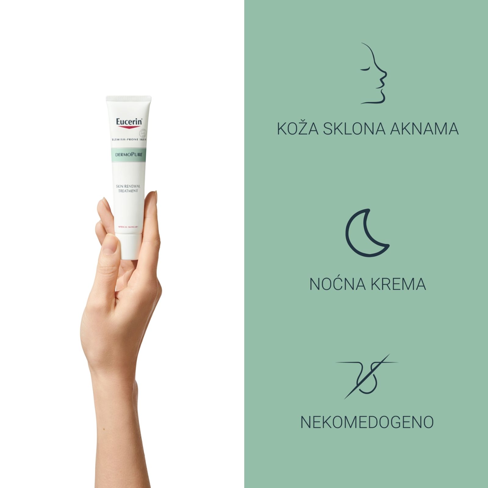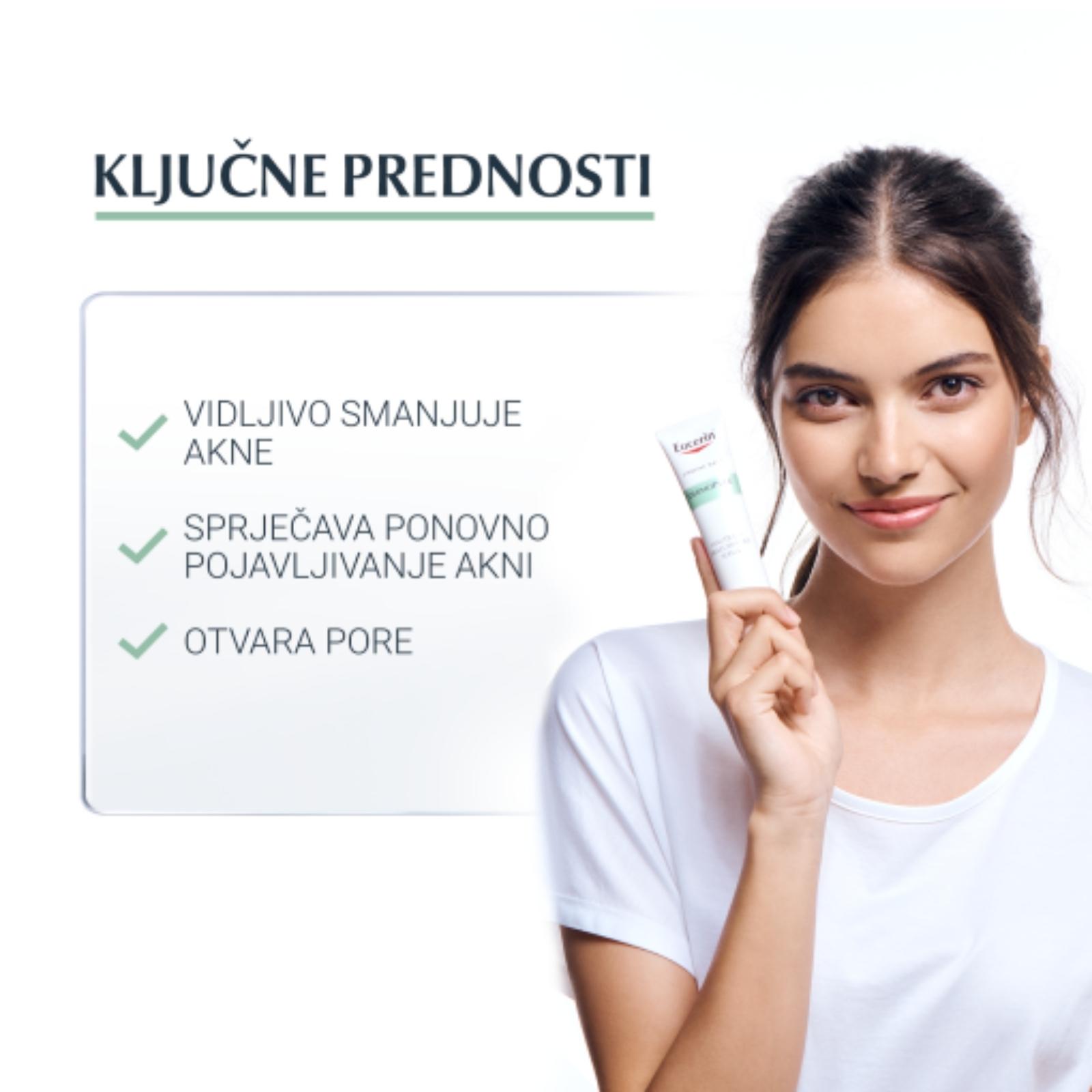 Inovativna Eucerin DermoPure obnavljajuća krema posebno je razvijena da smanjuje pojavu akni, prištića, papula i pustula te ublažava ožiljke od akna. Pogodna je za sve blage i umjerene oblike akni i ima trostruko djelovanje: