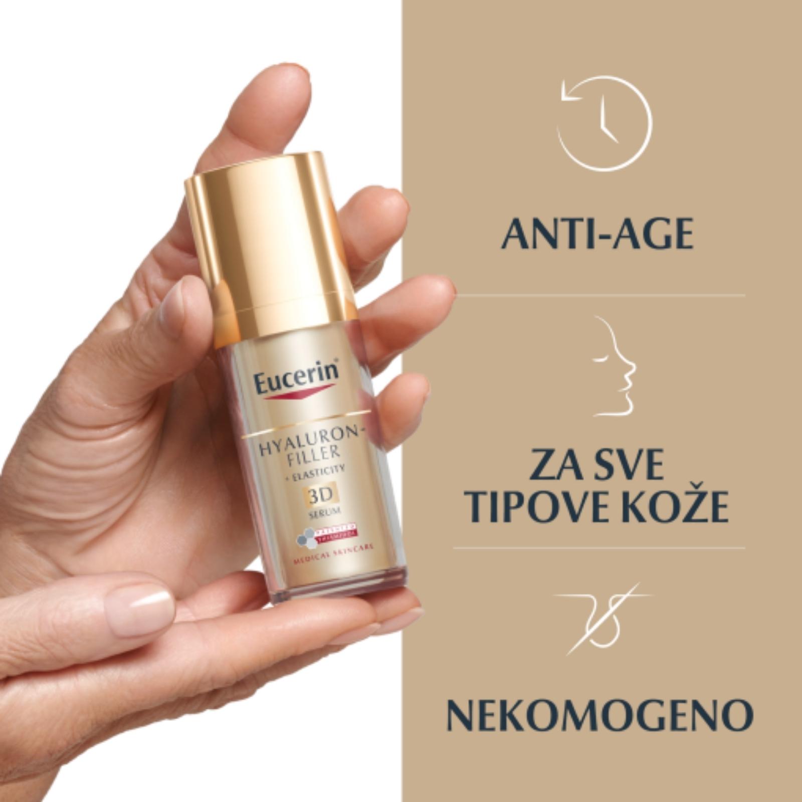 Eucerin Hyaluron-Filler + elasticity 3D je anti-age serum za zrelu kožu koji smanjuje hiperpigmentaciju unutar dva tjedna te sprječava ponovno pojavljivanje nepravilnosti, ispunjava duboke bore i poboljšava elastičnost kože.
