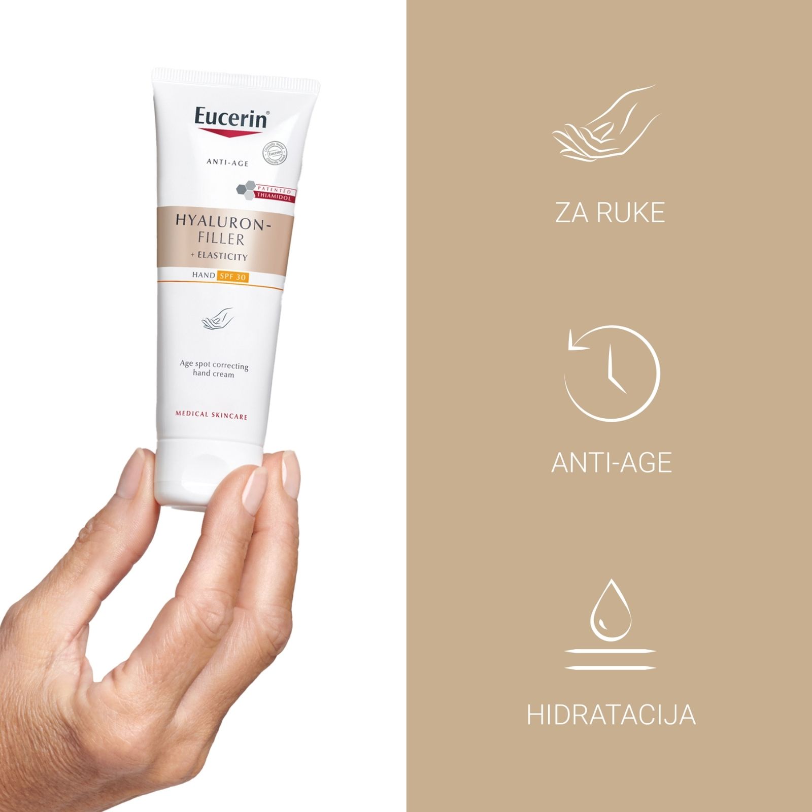 Kako bismo smanjili pojavu hiperpigmentacija i spriječili njihovo ponovno pojavljivanje, kreirali smo Eucerin Hyaluron-Filler + Elasticity korigirajuću kremu za hiperpigmentacije na rukama SPF30. Krema za ruke brzo se upija, poboljšava elastičnost kože, a također je nevjerojatno učinkovita u pružaju hidratacije, koža ruku je nahranjena tijekom cijelog dana.