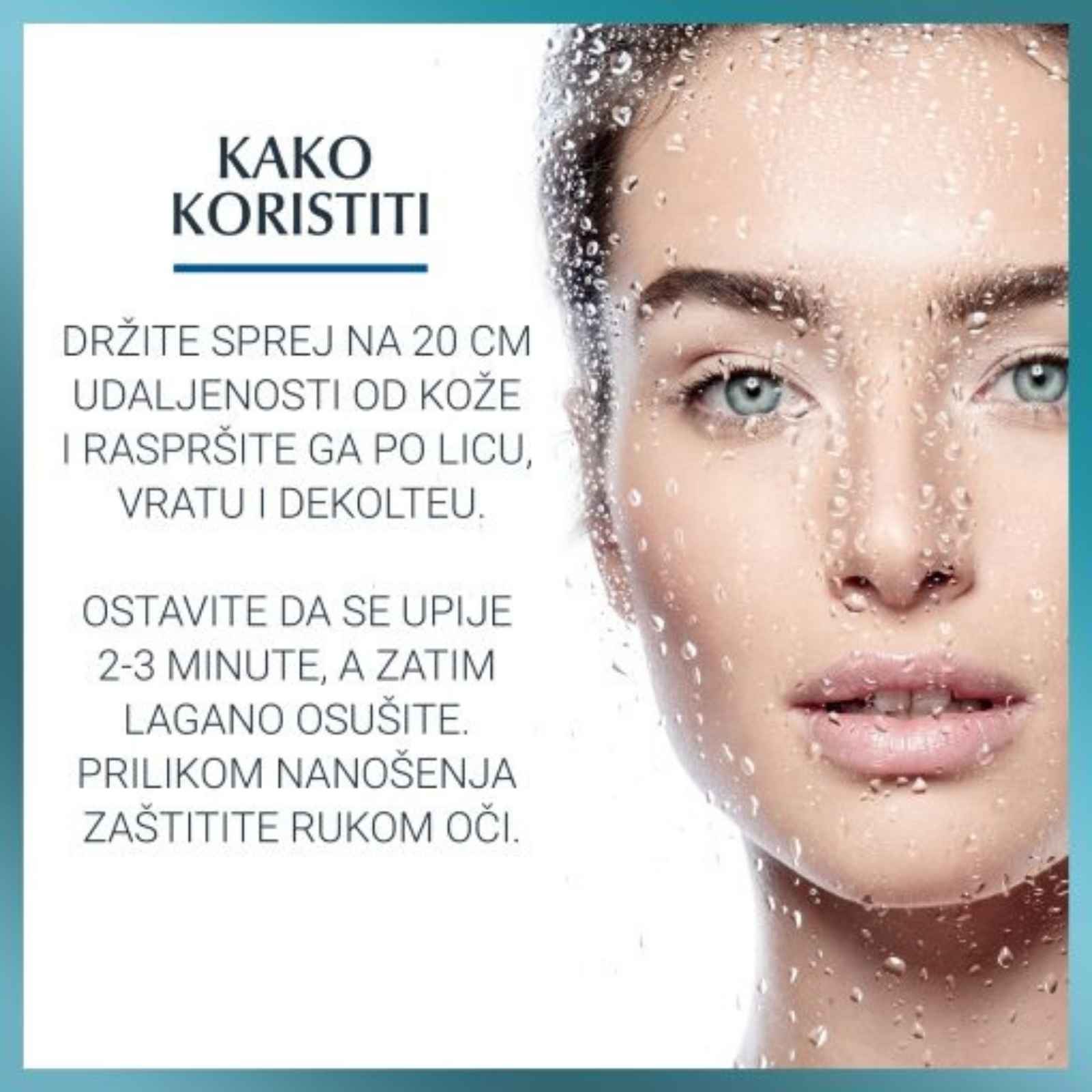 Držite sprej na 20 cm udaljenosti od kože i raspršite ga po licu, vratu i dekolteu. Ostavite da se upije 2-3 minute, a zatim lagano osušite. Prilikom nanonošenja zaštitite rukom oči.