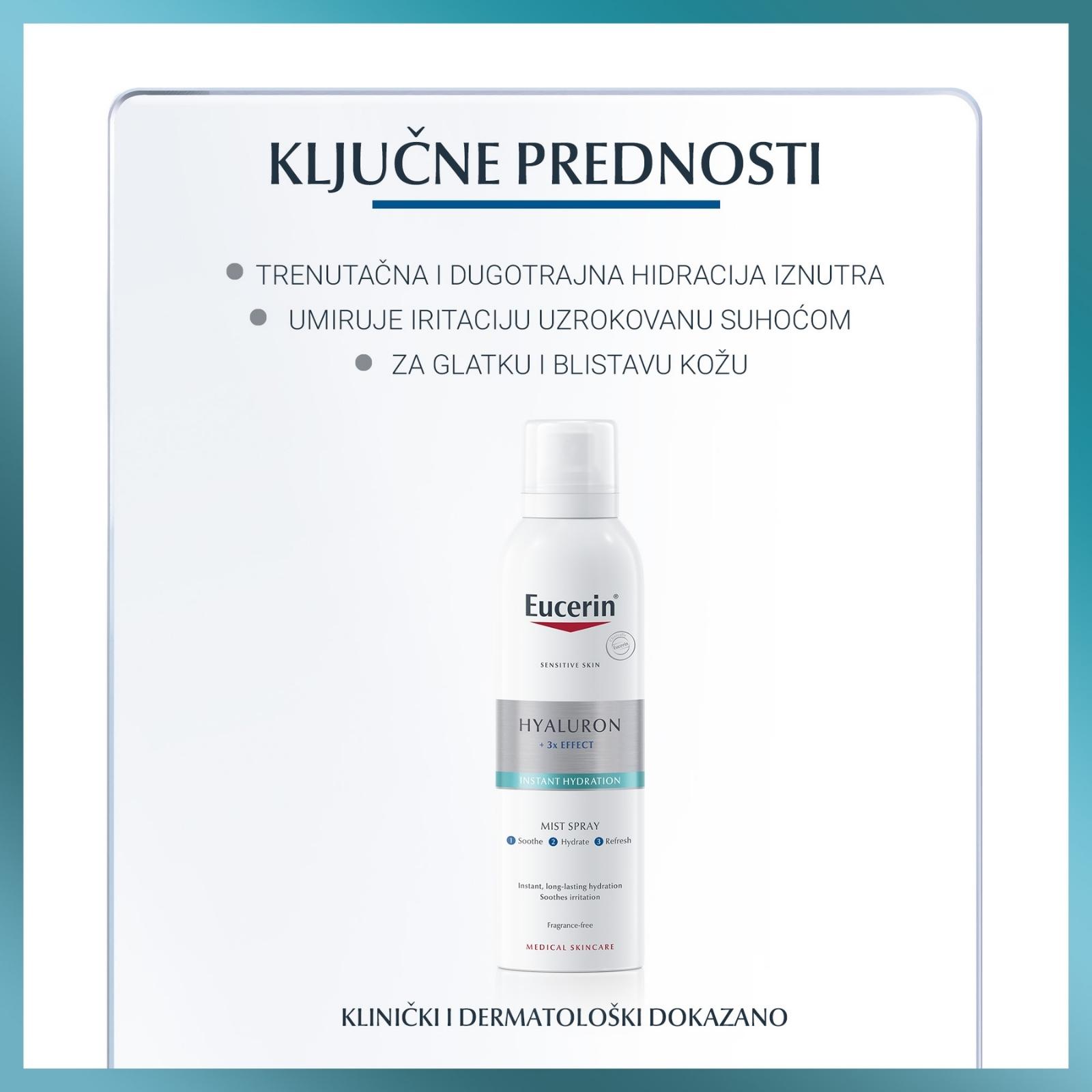 Osvježavajući sprejevi koji ne sadrže hidratantne sastojke ne mogu vezati vlagu. Čista voda brzo isparava čineći kožu sušom nego prije pri čemu ona može postati osjetljiva. Jedinstvena formula u Eucerin Hyaluron osvježavajućem spreju za lice i tijelo poboljšava hidracijski sustav kože, ravnomjerno raspoređuje vodu, zadržava vlagu te kožu čini glatkom i blistavom.