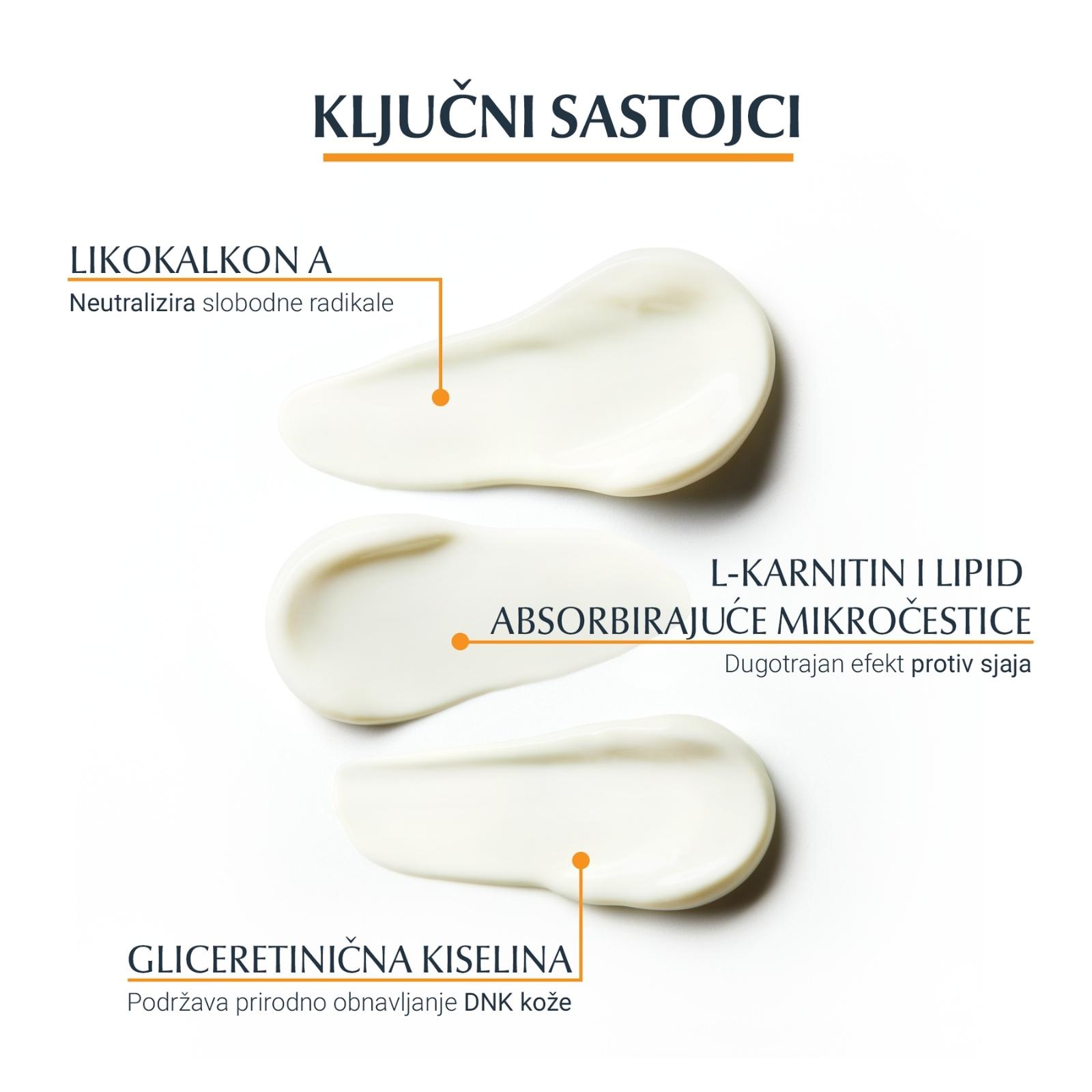 Napredna spektralna tehnologija kombinira širokopojasne i fotostabilne UVA/UVB filtre za visoku UV zaštitu s licochalconom A za neutraliziranje slobodnih radikala uzrokovanih UV i HEVIS svjetlošću. Gliceretinična kiselina podržava vlastiti mehanizam obnavljanja DNA kože. Formula također sadrži inovativu tehnologiju kontrole mašćenja i reguliranja sebuma s L-karnitinom i upijajućim mikro česticama za trenutačni učinak suh na dodir i dugotrajan učinak protiv sjaja do osam sati.