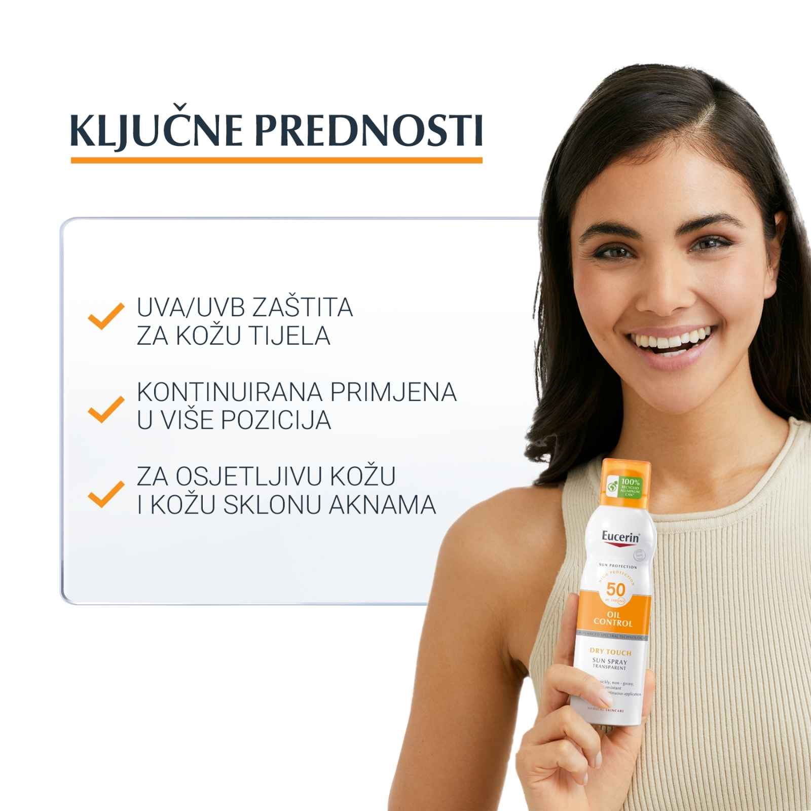 Eucerin Oil Control Dry Touch SPF 50 sprej za tijelo s visokim zaštitnim faktorom za osjetljivu kožu je i dermatološki prikladan za osjetljivu kožu uključujući i kožu s aknama.