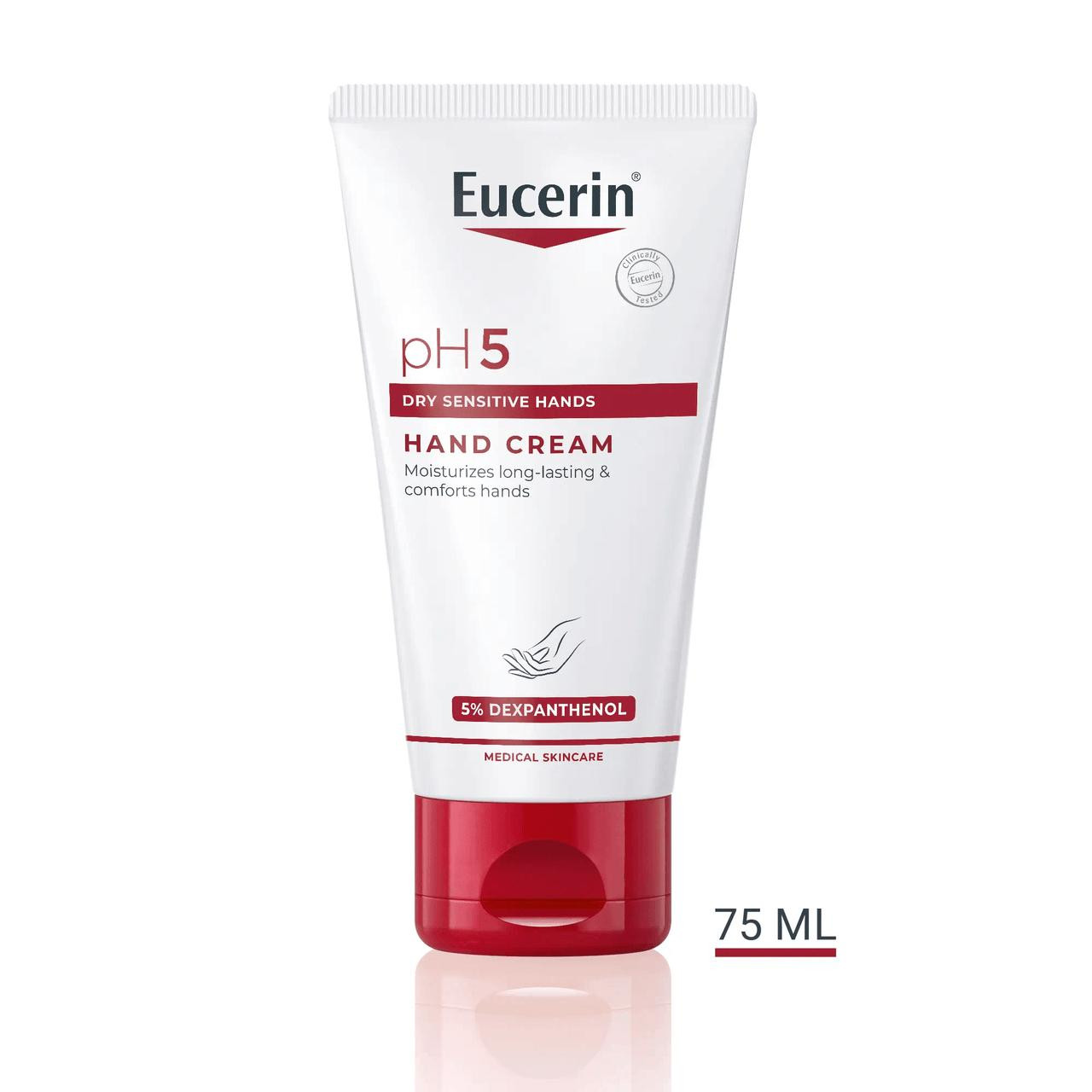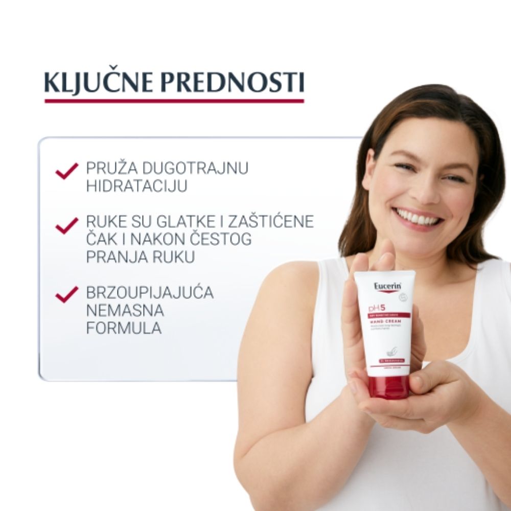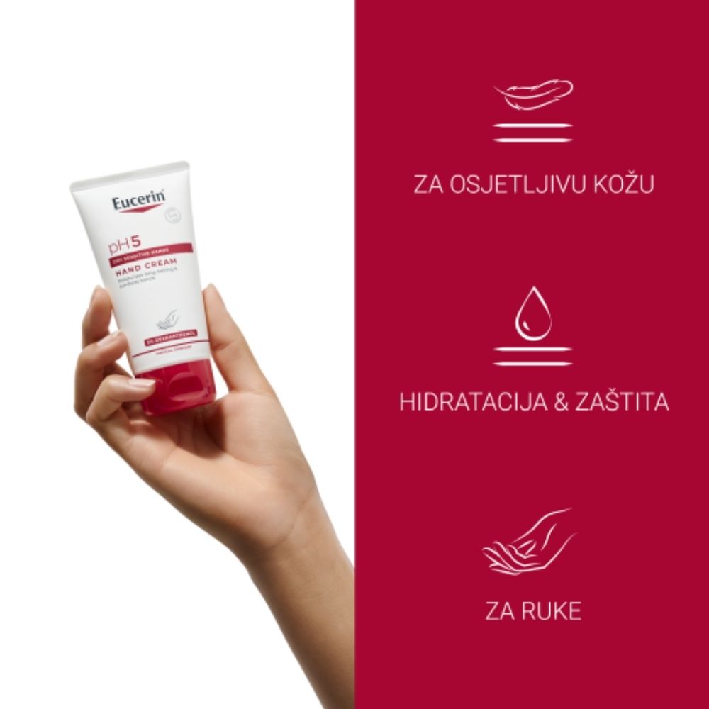 Eucerin pH5 krema za ruke posebno je formulirana za suhu i osjetljivu kožu ruku kojoj je potrebna svakodnevna zaštita i njega. Pomaže pružiti dugotrajnu hidrataciju, brzo se upija i ostavlja ruke glatkima, nahranjenima i zaštićenima od isušivanja.