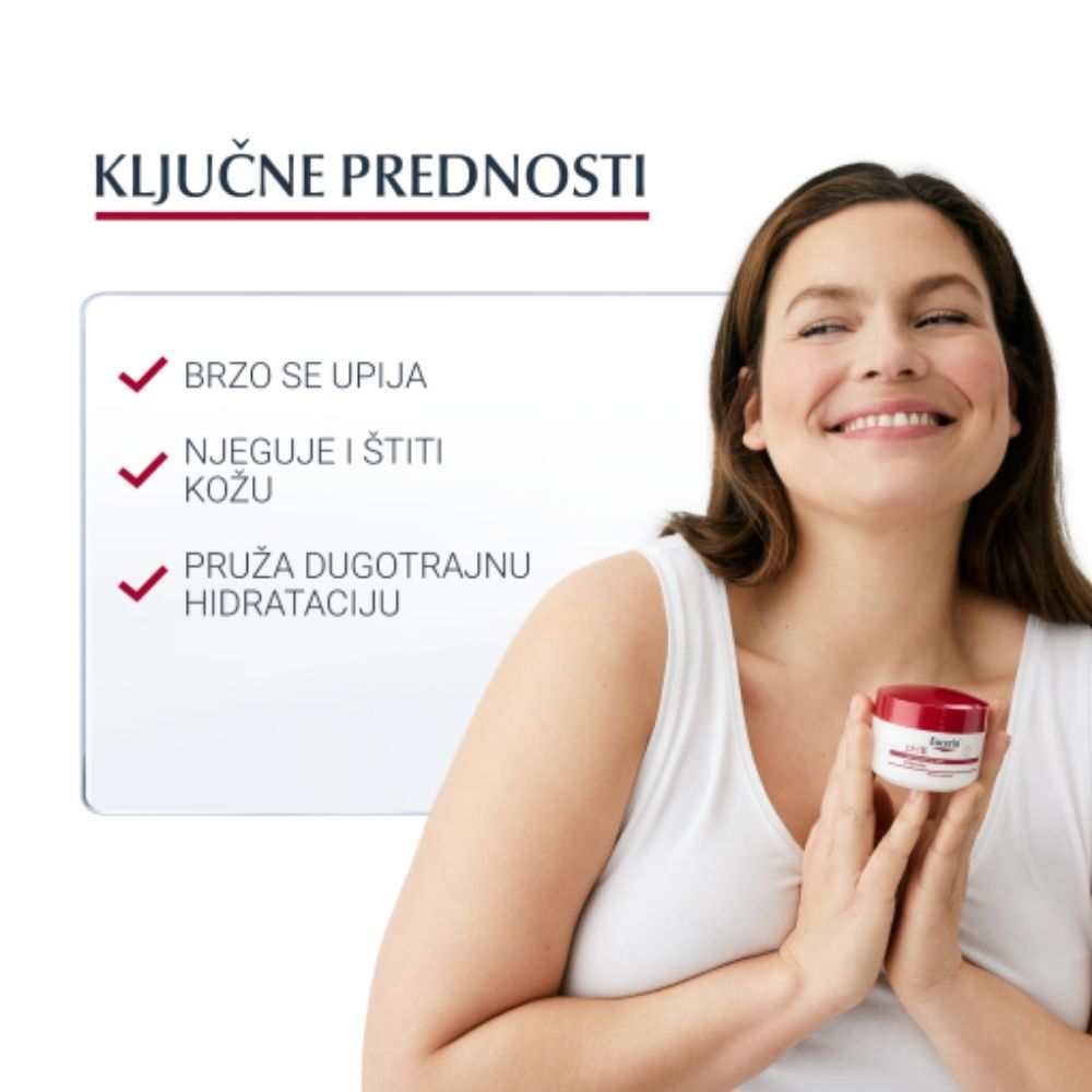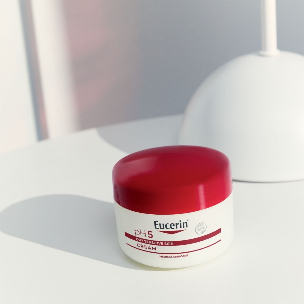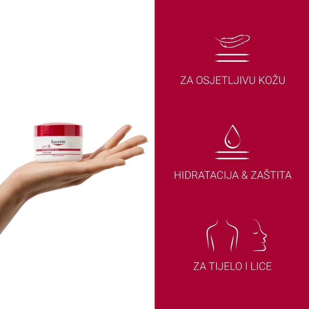 Eucerin pH5 krema za osjetljivu kožu namijenjena je svakodnevnoj njezi suhe i osjetljive kože lica i tijela. Posebno je formulirana kako bi koži pružila potrebnu hidrataciju, pomogla očuvati njezinu prirodnu ravnotežu i smanjila osjećaj osjetljivosti uzrokovan vanjskim utjecajima.
