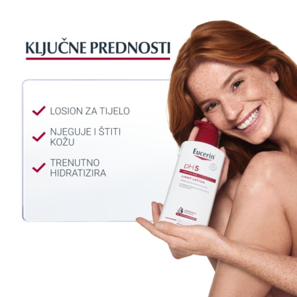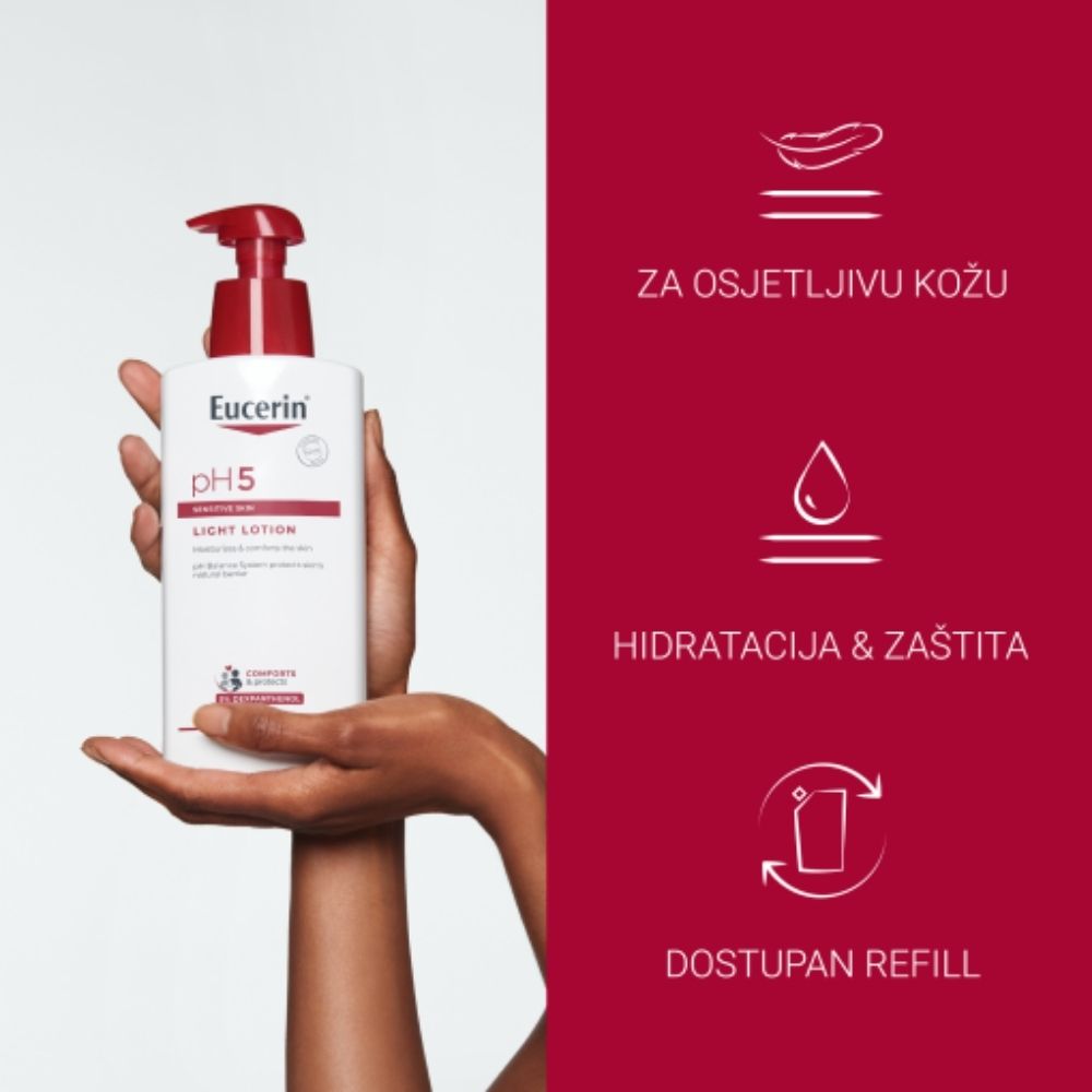 Eucerin pH5 Light losion posebno je razvijen za svakodnevnu njegu suhe i osjetljive kože kojoj je potrebna dugotrajna hidratacija i zaštita. Zahvaljujući laganoj teksturi, brzo se upija bez ostavljanja masnih tragova te kožu ostavlja mekom, glatkom i ugodnom na dodir.