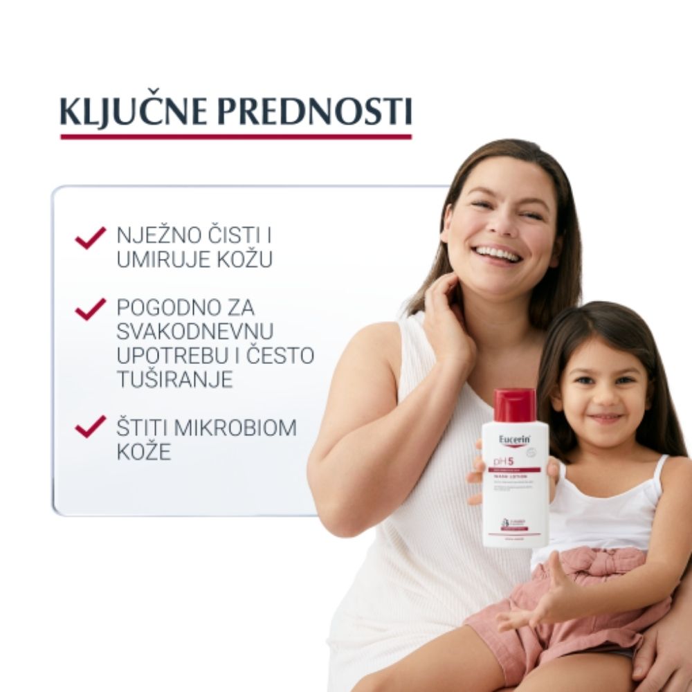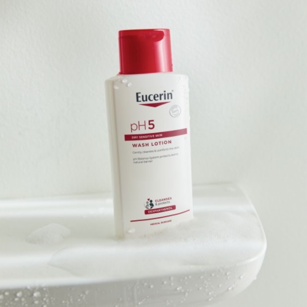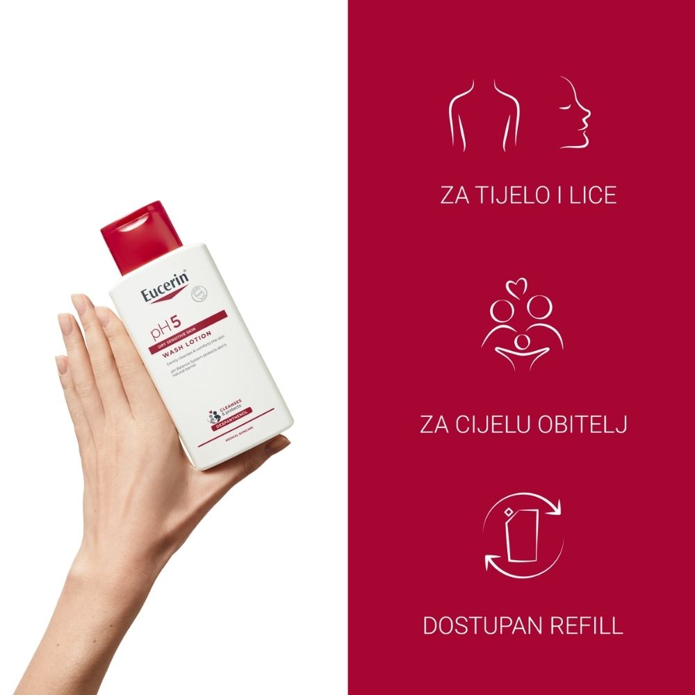 Eucerin pH5 losion za pranje namijenjen je nježnom, ali učinkovitom čišćenju suhe i osjetljive kože. Formula bez sapuna pomaže ukloniti nečistoće bez isušivanja kože te pritom podržava njezinu prirodnu zaštitnu barijeru.