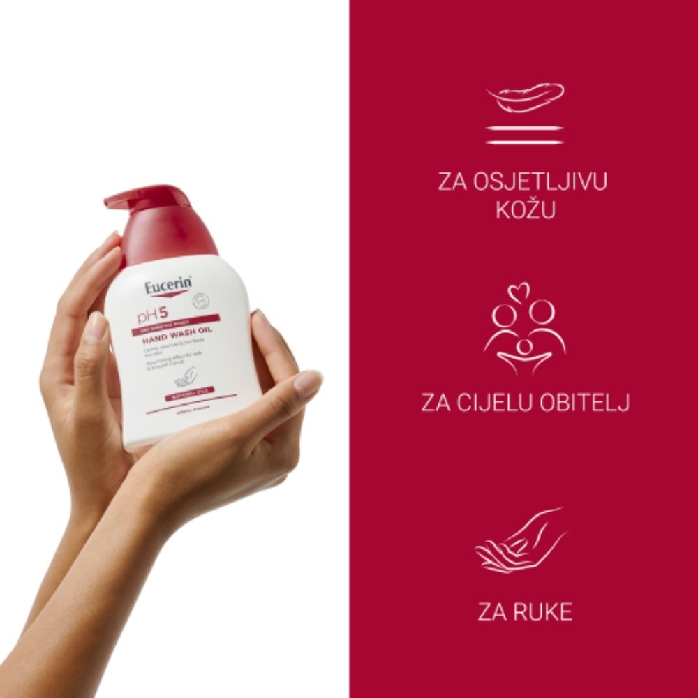 Eucerin pH5 uljno sredstvo za pranje ruku nježno čisti suhe i osjetljive ruke bez isušivanja, čak i uz često pranje. Formula je razvijena kako bi poštovala prirodnu ravnotežu kože i podržala kožni mikrobiom, dok istovremeno pomaže očuvati mekoću i ugodu kože.