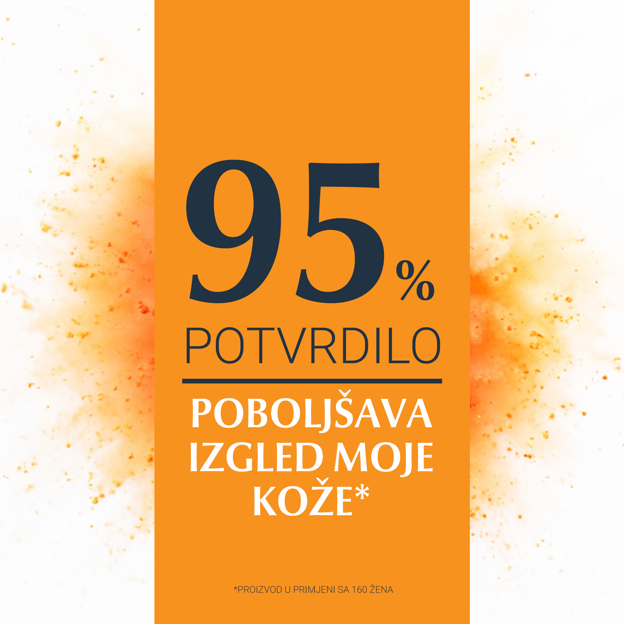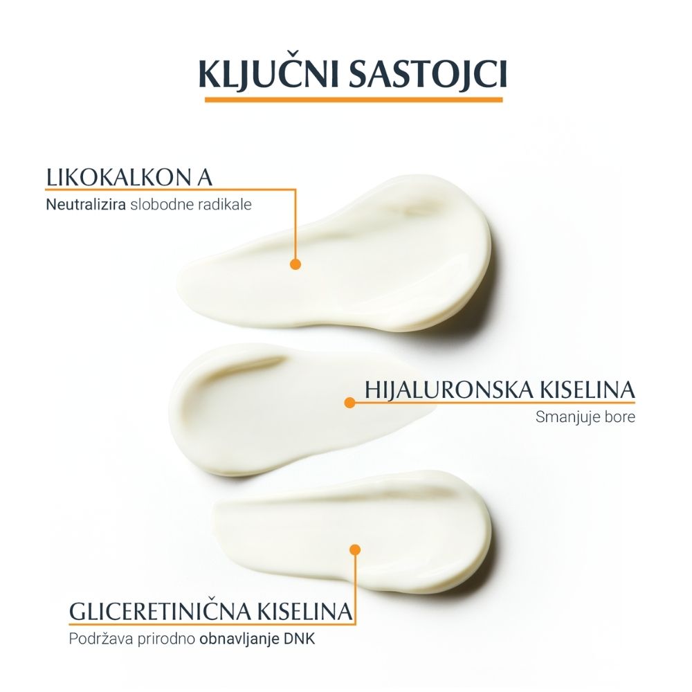 Formula s likokalkonom A pomaže neutralizirati slobodne radikale uzrokovane UV i HEVIS svjetlošću, dok gliceretinična kiselina podržava prirodni mehanizam obnavljanja DNA kože. Dodatno je obogaćena kratkolančanom i dugolančanom hijaluronskom kiselinom koja vidljivo smanjuje bore te doprinosi glađem i njegovanijem izgledu kože lica i dekoltea.
