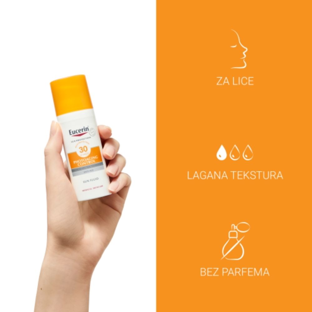 Eucerin Photoaging Control Fluid SPF 30 svakodnevna je zaštita od sunca za lice koja pomaže u sprječavanju fotostarenja kože. Zahvaljujući naprednoj spektralnoj tehnologiji, pruža visoku UVA/UVB zaštitu te štiti kožu i od visokoenergetske vidljive svjetlosti (HEVIS), koja može potaknuti stvaranje slobodnih radikala i dodatno opteretiti kožu.