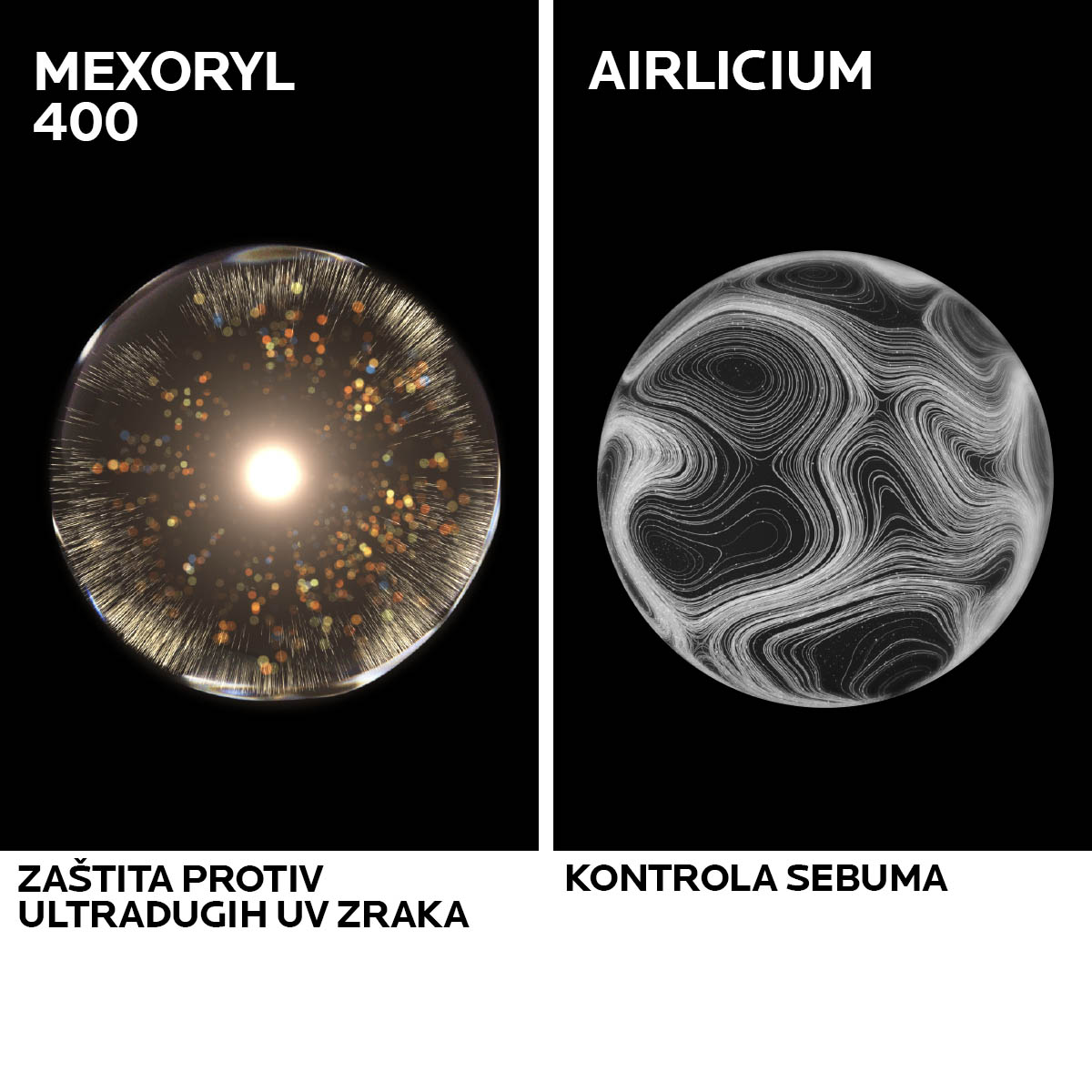 TEHNOLOGIJA ZA KONTROLIRANJE MASNOĆE: Air LiciumTM: matirajuće mikročestice koje odmah upijaju višak sebuma i pomažu pri kontroliranju izvora sjaja (sebum, znoj, vlaga) kako bi dan za danom omogućile smanjivanje masnoće kože.