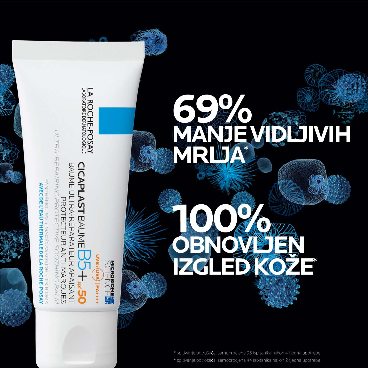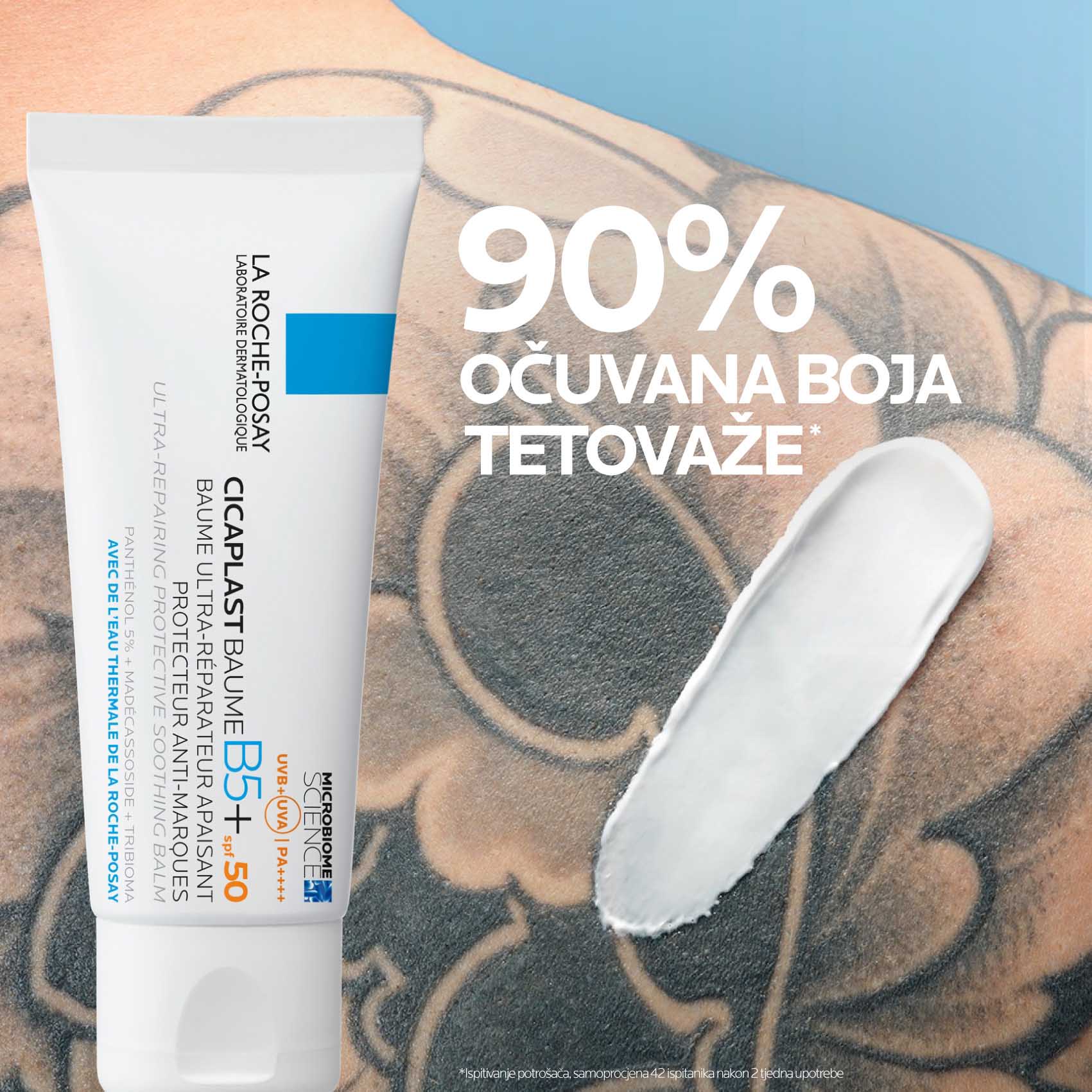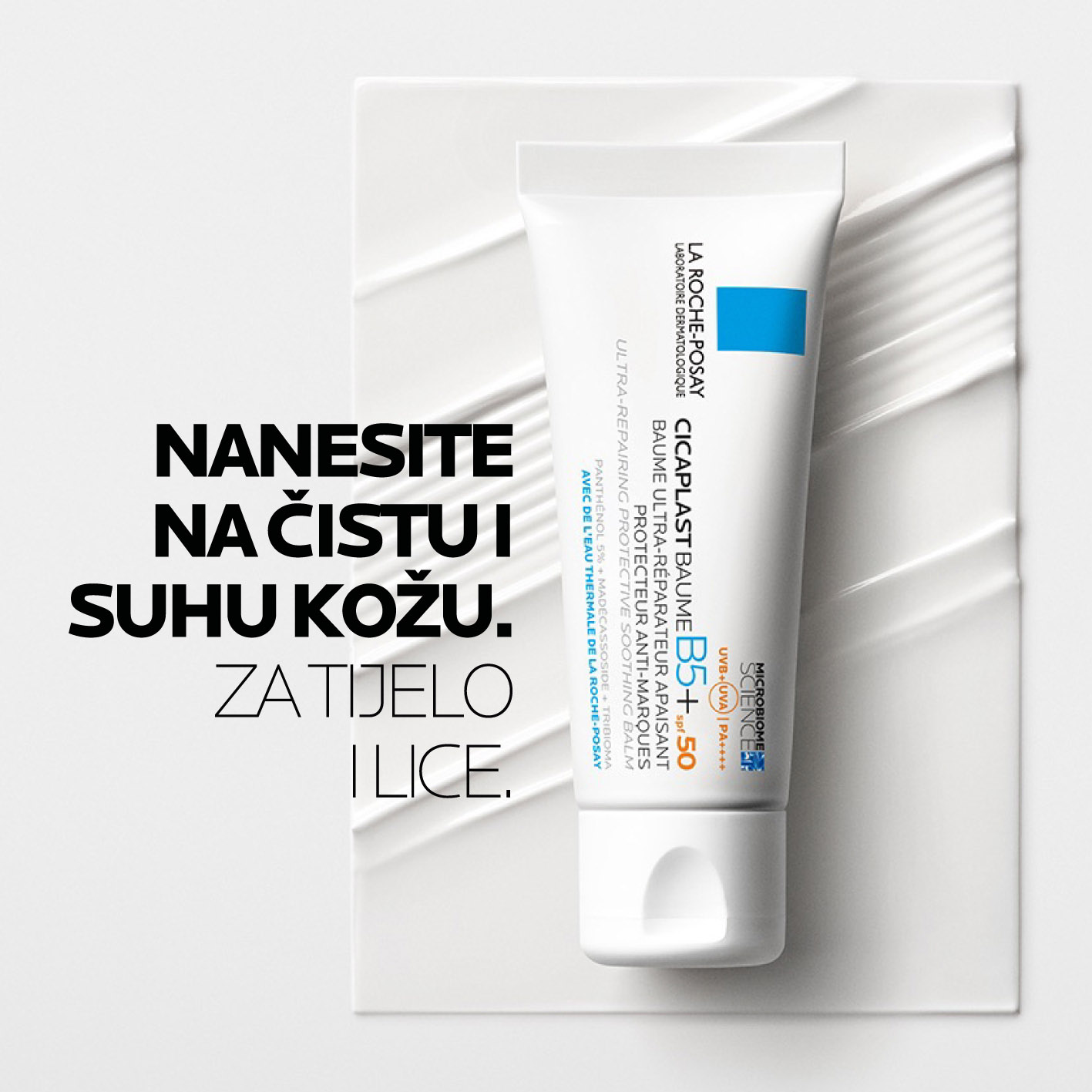 La Roche-Posay CICAPLAST BAUME B5+ SPF50, ultra-obnavljajući smirujući zaštitni balzam. Prikladno za odrasle i djecu. Prikladno nakon površinskih dermatoloških tretmana i za tetoviranu kožu. Formula pogodna za masažu.
