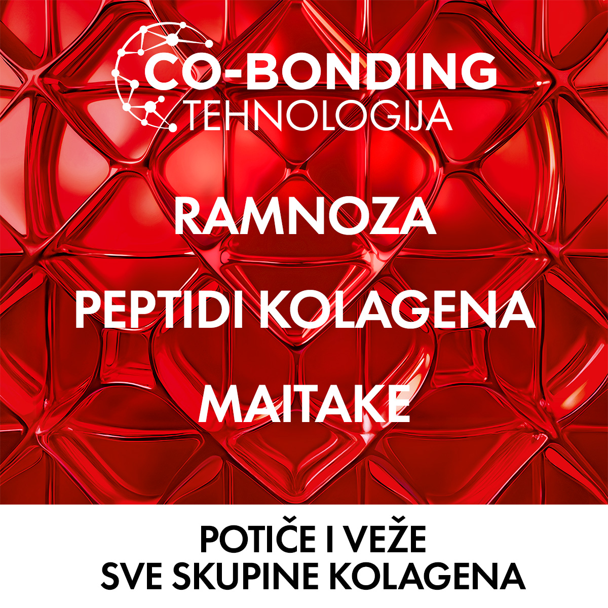 • Sa Co-Bonding tehnologijom [ramnoza+peptidi+Maitake] potiče i veže sve skupine kolagena. (1)