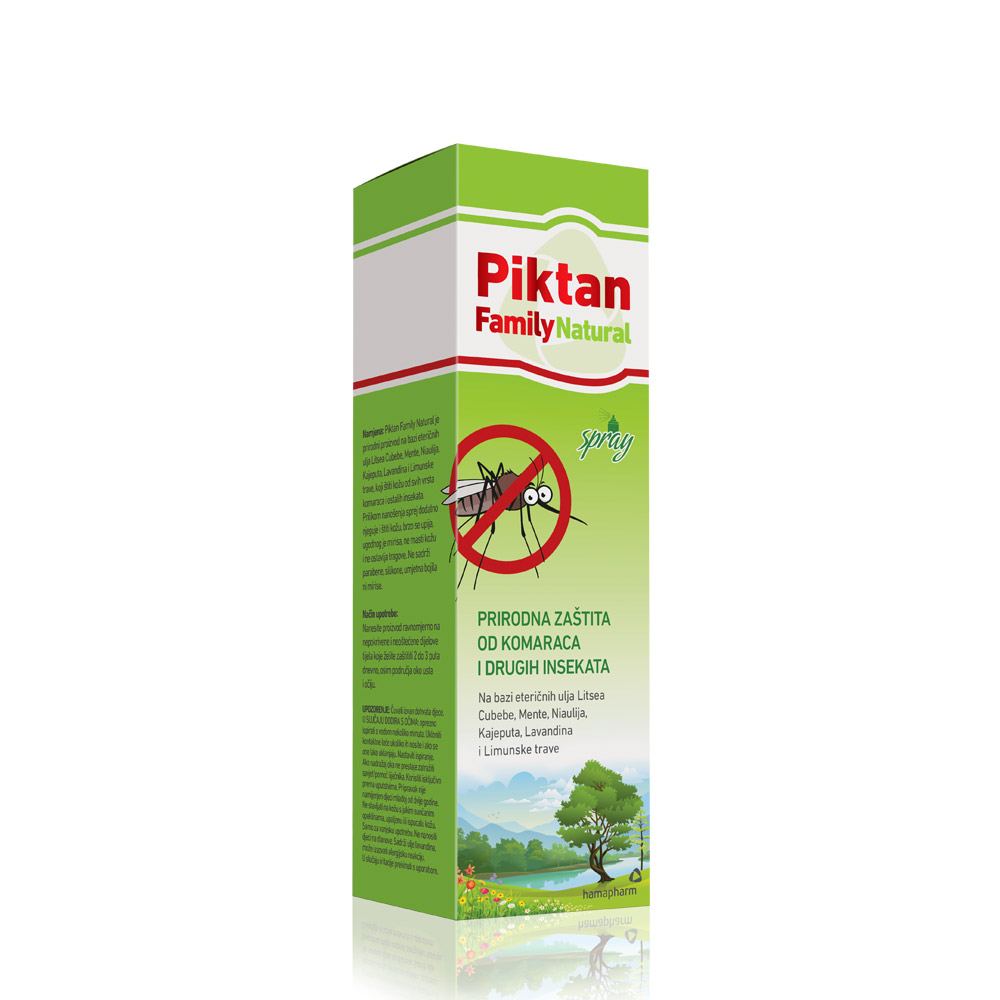 Piktan Family Natural je prirodni repelent koji štiti kožu od svih vrsta komaraca i ostalih insekata. Sadrži učinkovitu koncentraciju kombinacije eteričnih ulja Litsea Cubebe, Mente, Niaulija, Kajeputa i Lavande.