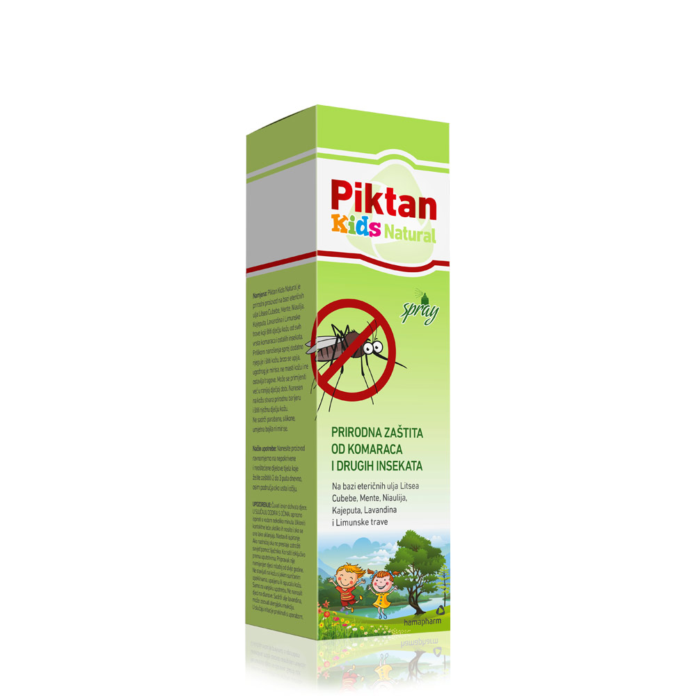 Piktan Kids Natural je prirodni repelent koji štiti dječju kožu od svih vrsta komaraca i ostalih insekata. Sadrži učinkovitu koncentraciju kombinacije eteričnih ulja Litsea Cubebe, Mente, Niaulija, Kajeputa i Lavande, prilagođenu dječjoj dobi.