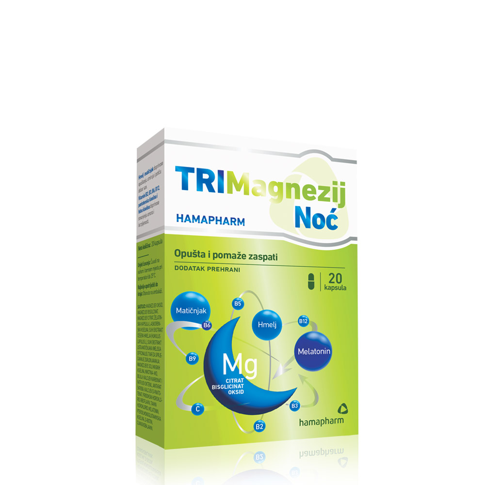 Magnezij umiruje živčani sustav, poboljšava san i smanjuje tjeskobu. Manjak magnezija dovodi do slabije kvalitete sna. TriMagnezij Noć Hamapharm trostruka je kombinacija magnezij bisglicinata, citrata i oksida za 5 puta veću iskoristivost, bržu apsorpciju i bolju bioraspoloživost magnezija u organizmu.