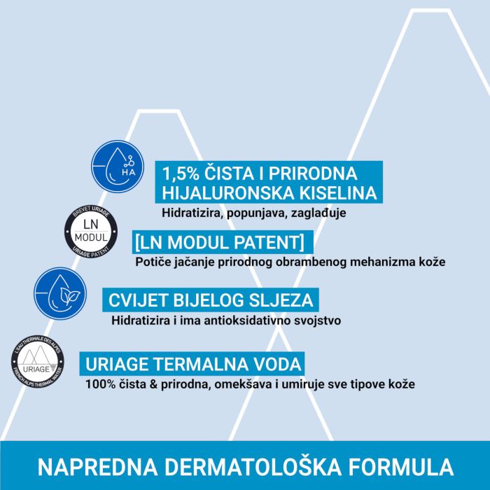 Učinkovit serum koji pruža 24-satnu hidrataciju dehidriranoj koži. Pruža osjećaj mekoće i ostavlja kožu blistavom nakon svakog korištenja. Formula sadrži hidratantni kompleks koji pridonosi obnovi površinskog sloja kože, što utječe na sprječavanje dehidracije kože. Dodatak Uriage termalne vode pruža umirujuće djelovanje te smanjuje neugodan osjećaj zatezanja i iritacije. Redovitim korištenjem seruma može se pojačati hidratacijski učinak kreme za čak 90%. Proizvod je hipoalergen i dermatološki testiran.