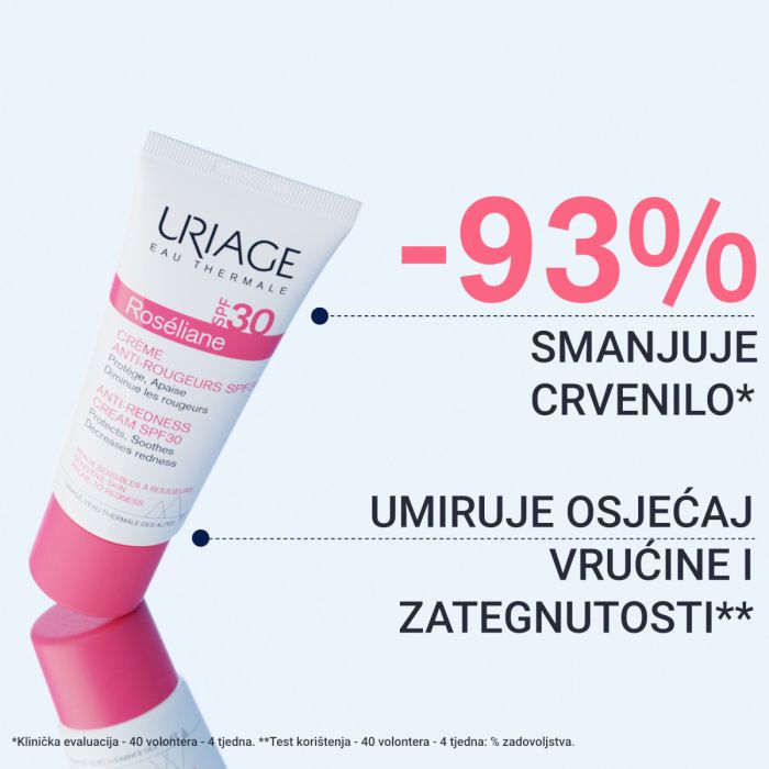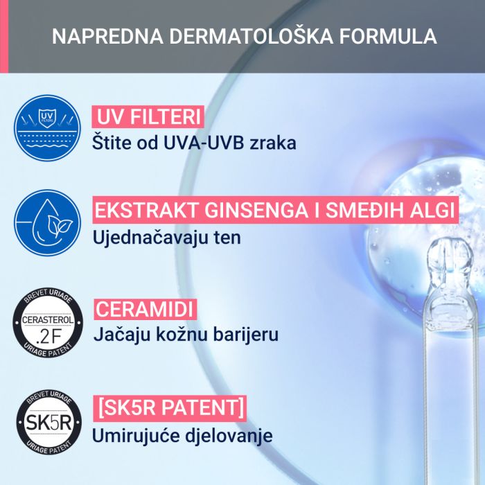 Krema namijenjena osjetljivoj koži sklonoj crvenilu s dodatnom zaštitom od štetnih UV zraka SPF30. Zahvaljujući kombinaciji Cerasterol – 2F kompleksa i Uriage termalne vode krema pridonosi obnovi i umirivanju kožne barijere, a dodatak ekstrakta ginsenga i crvene alge ima ulogu u zaštiti krvnih žila i poticanju zdrave mikrocirkulacije lica.