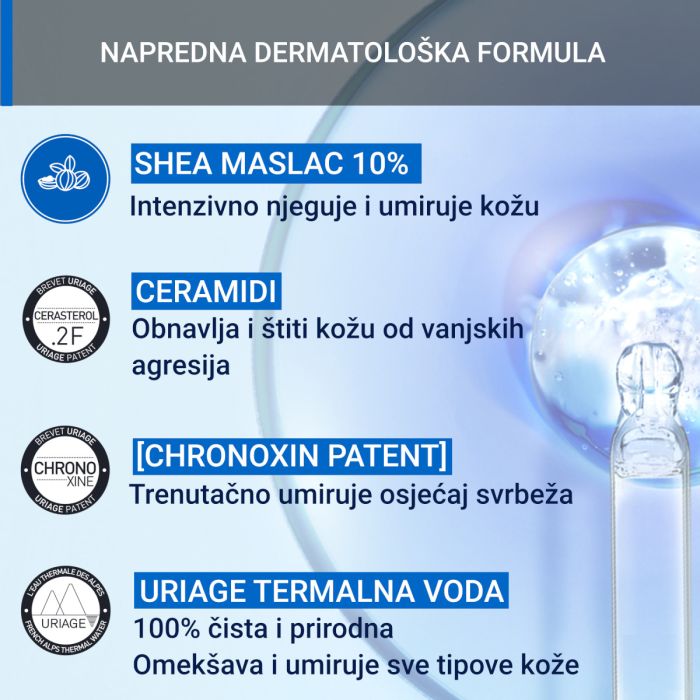 Krema za lice bogate teksture za njegu vrlo suhe kože sklone atopiji. Sadrži Cerasterol – 2F kompleks koji ima ulogu u obnovi površinskog sloja kože te umirivanju i zaštiti od štetnih vanjskih utjecaja. Dodatak Uriage termalne vode, minerala i oligoelemenata pridonosi zaštiti od isušivanja i hidrataciji kože lica.