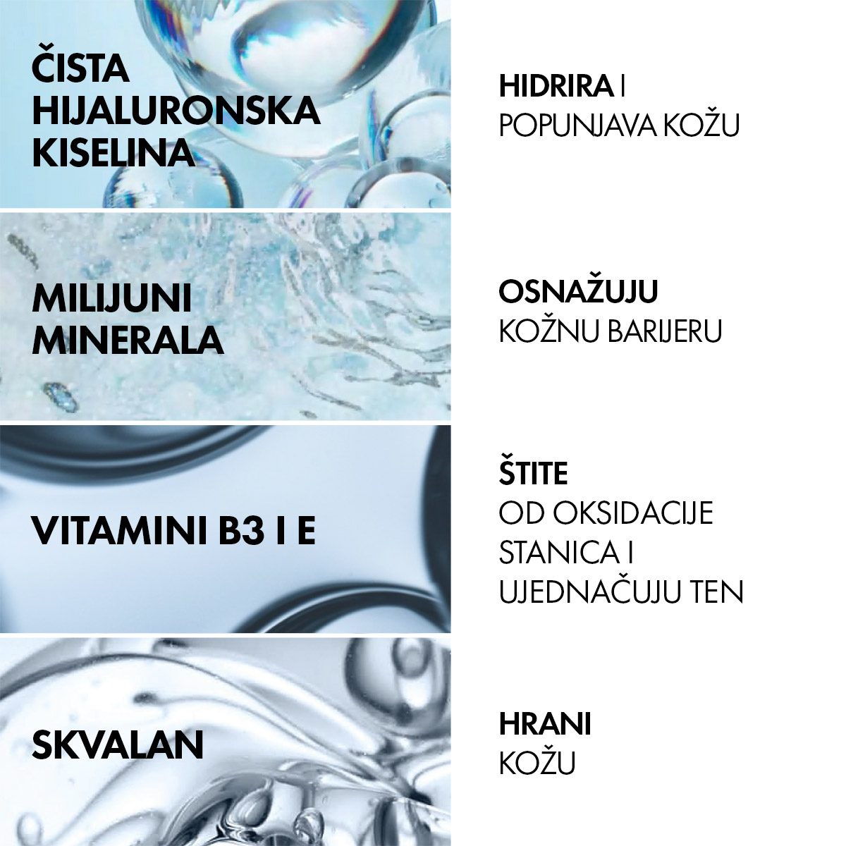 • 7,3 mg Vichy minerala iz vulkanske vode, 0,1 % hijaluronske kiseline, 2,2 % vitamina B3 i E, 1 % skvalana